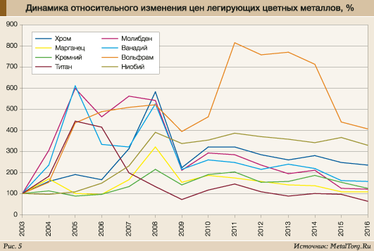 Первый продемонстрировал значительный подъем цен в 2011–2014 годах. Участники рынка связывали подъем с сокращением добычи и производства концентрата китайскими заводами, на которые приходится 85% мировых поставок этого металла. Во второй половине 2015 года цены пошли вниз (рис. 5), хотя официальная китайская статистика не фиксировала сколько-нибудь значимого увеличения объемов выпуска концентрата вольфрама.