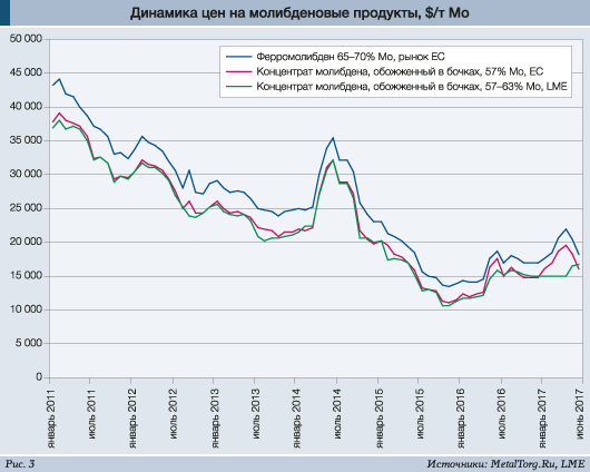 Стоит заметить, что объемы добычи молибденовых руд все последние годы сокращаются. Если в 2014 году по всему миру на рынок выпустили 281 тыс. т молибдена в концентрате, то в 2016 году эта цифра составила всего около 227 тыс. т. Причину такой динамики несложно понять, взглянув на график цен молибденового сырья в последние годы (рис. 3).