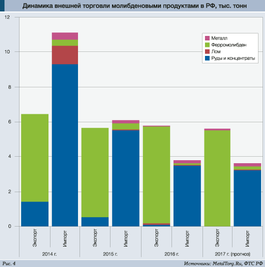 С импортом и экспортом молибденовой продукции вообще наблюдается довольно странная история. По данным ФТС РФ, в 2011–2013 годах в страну поставлялись количества концентратов, достаточных для выработки 1–2 тыс. т ферромолибдена.