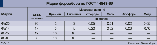 Высокая температура плавления чистого бора (2075°С) гарантирует сложность его прямого применения в качестве лигатуры. Поэтому для металлургических применений и прежде всего – для легирования сталей в мире широко выпускается ферробор различного качества с типовым содержанием бора до 20–25%. В России этот ферросплав долгие годы производился по ГОСТ 14848-69 (СТ СЭВ 988-89) методом алюминотермии. По нему марки и химический состав ферробора должны соответствовать указанным в таблице 1.