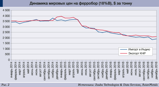 Китайские цены на ферробор в тот момент как раз вышли на пик, подобравшись к $4100 за т, и немедленно начали длительное и неуклонное падение. Естественно, как и цены на прочих важных грузопотоках этого ферросплава в мире (рис. 2).