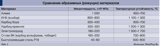 Содержание кубического нитрида бора в них составляет 80–90% при среднем размере частиц порядка 1–3 мкм. О синтезе крупных (как алмаз) кристаллов КНБ речь уже не идет. А все усилия ученых и технологов направлены на формирование готовых абразивных пластин на прочных связующих материалах (TiN, Co-W и т.п.). При этом структурный результат чаще похож на твердосплавные материалы на основе карбида вольфрама (типа ВК20 и т.п.). Хотя конечные свойства этих КНБ-изделий существенно выше ввиду много большей твердости самого кубического нитрида бора (табл. 2).