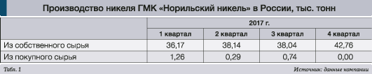 Основной подъём пришёлся на вторую половину года, совпав с положительными изменениями в динамике производства. По итогам IV квартала 2017 года объёмы выпуска никеля на российских предприятиях «Норникеля» из собственного сырья выросли по сравнению с началом года на 18%. По информации ГМК, основная причина роста – в увеличении переработки файнштейна Заполярного филиала на Кольской ГМК.