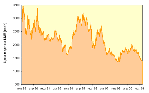 Положение на рынке цветных металлов в IV квартале 2001 года Продолжительное падение рынка цветных металлов по видимому подошло к своему логическому окончанию: многие аналитические агентства констатируют достижения минимальных цен на рынке. Дальнейшее понижение уже серьезно скажется на производстве данных металлов, и, по всей видимости, возможно повторение ситуации 1992-94 гг., когда падение потребления и ухудшение мировой конъюнктуры на рынке ряда цветных металлов спровоцировало глубокие кризисы, приведшие к перераспределению собственности, резкому сокращению производства и разорению многих участников рынка. Россияне отлично помнят данную ситуацию. При падении производства и снижении мировых цен до уровня ниже рентабельного (вторая половина 1993 – начало 1994 гг., график 1) многие отечественные производители алюминия оказались на грани разорения. Это спровоцировало внутри российскую войну цен, сопровождаемую жестоким переделом собственности внутри страны, а также ознаменовалось беспрецедентным снижением производства алюминия в стране. Выход из ситуации был тогда найден путем введения толлинговых схем производства, и хотя многие видели в этом своеобразный способ выведения средств предприятий в офф-шоры, положительный эффект от данной меры был все же существенным, что позволило отрасли не сократить производственные мощности и при изменении мировой конъюнктуры в течение короткого времени вновь нарастить объемы производства, что сделало алюминиевую отрасль к настоящему моменту едва ли не ведущей отраслью цветной металлургии. Наступивший на рынках период охлаждения вновь приблизил алюминщиков к порогу отрицательной рентабельности. Цены уже достигли минимума и при возможном дальнейшем снижении последствия могут стать плачевными.