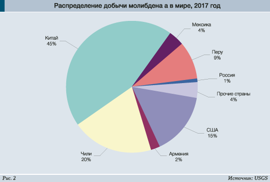 В очередной раз пересмотрев свои оценки, USGS разом ретроспективно увеличила китайскую добычу с 80–90 тыс. до 130 тыс. т в 2016–2017 годах. И это – на фоне широко известных экологических проверок в КНР, заметно повлиявших на деятельность металлургов Поднебесной. В результате, по данным USGS, доля Китая в мировой добыче молибдена возросла до 45% и стала примерно соответствовать распределению залежей молибдена по планете (рис. 2).