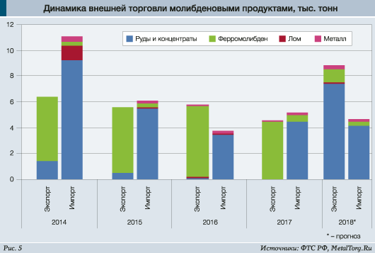 По всей видимости, добываемый в России молибден нынче экспортируется с минимальным уровнем обогащения, а его внутренняя переработка фактически прекратилась. На это же указывает тот факт, что в 2018 году мы экспортировали даже больше, чем добыли. Вероятно, в ход пошли ранее накопленные складские запасы.