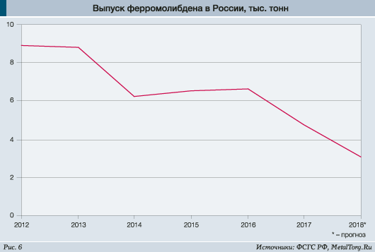 В августе 2017 года определением Арбитражного суда города в отношении ЗАО «Камышинский литейно-ферросплавный завод» была введена процедура наблюдения. Правда, подозреваем, что надо дождаться отчётности Нижневолжского завода, и всё окажется не так плохо. Тем не менее выпуск ферромолибдена в России в последние годы стремительно сокращается (рис. 6).