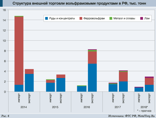 В итоге можно констатировать, что общее сокращение объёмов добычи вольфрама в стране закономерно привело к падению объёмов его экспорта. Показатель 2018 года, по нашим прогнозам, окажется минимальным за последние 5 лет (рис. 4).