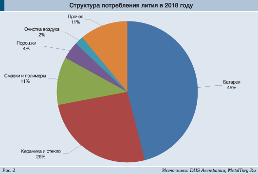 Три года назад Илон Маск предрекал гораздо более высокие темпы, тем не менее потребности в литиевых аккумуляторах, а значит, и в литии выросли многократно. Уже сейчас среднемировая доля потребления лития аккумуляторной промышленностью составляет около 46% (рис. 2). В США за последние три года она выросла с 35 до 56%.