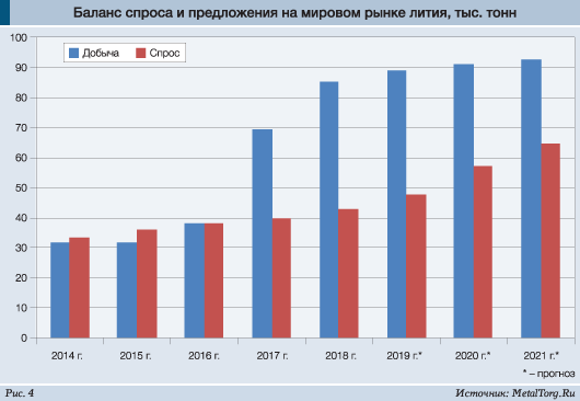 В то же время мировое потребление лития продолжает расти. По оценкам Департамента промышленности Австралии, в 2018 году оно прибавило примерно 10%, в 2019 году ожидается увеличение ещё на 12–13%. Однако баланс рынка выглядит совершенно не вдохновляюще для цен этого металла (рис. 4).