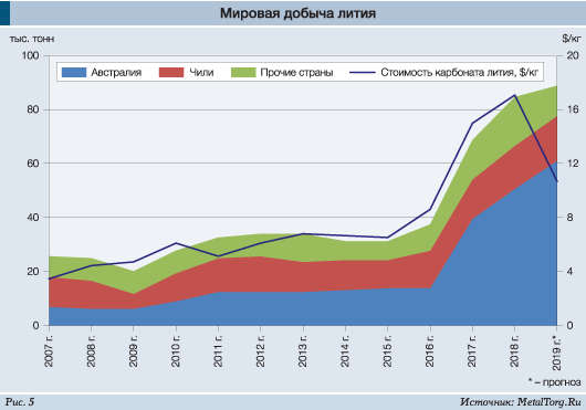 Фактически за два года объёмы добычи лития возросли более чем в 2 раза, сильно обогнав динамику спроса. Что интересно, практически единственным виновником возникновения избытка этого сырья на рынке стала Австралия (рис. 5).