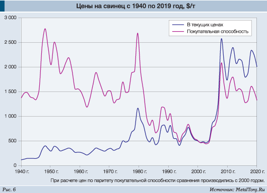 Хотя это не критически много, но достаточно, чтобы по мере нарастания избытка цены имели тенденцию к снижению. Объективно говоря, по историческим меркам они сейчас довольно высоки, поэтому действительно серьёзных негативных последствий для производителей свинца не ожидается (рис. 6).