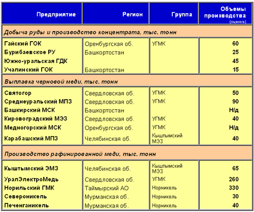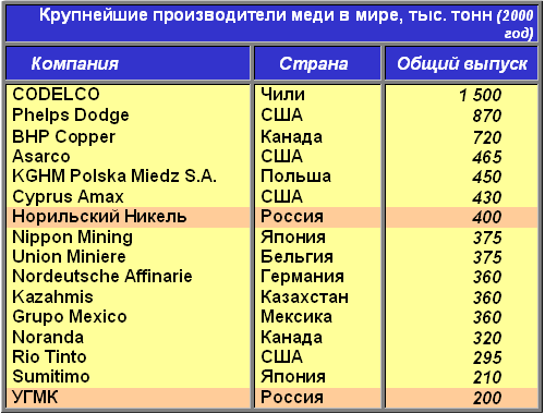 Как уже было отмечено в предыдущем нашем обзоре, крупнейшие мировые производители меди сосредоточены, как правило, в районах залегания медных руд. Кроме того, следуя последним тенденциям на рынках, все крупнейшие производители меди в течение конца 90-ых начале 2000 года проводили активные процессы укрупнения и консолидации. Не обошла стороной данная тенденция и представителей России. Так, после ряда объединений на медном рынке в стране сформировалось устойчивое равновесие, поддерживаемое двумя крупнейшими игроками – Уральской горно-металлургической компанией (УГМК), объединяющей в основном европейские предприятия по выпуску и добычи меди в России, и ГМК «Норильский никель», консолидировавшей в основном северные предприятия отрасли. Обе эти компании являются крупнейшими и занимают высокие позиции в мировой табели о рангах медных производителей.