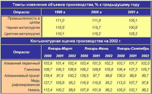 Согласно расчетам специалистов ЦМЭИ на основе данных Лондонской биржи металлов, средние цены мирового рынка на никель снизились на 31,3%, алюминий -14,1%, медь - 22,9% (сентябрь 2001 к декабрю 2000 г.).