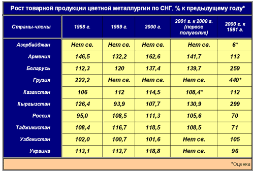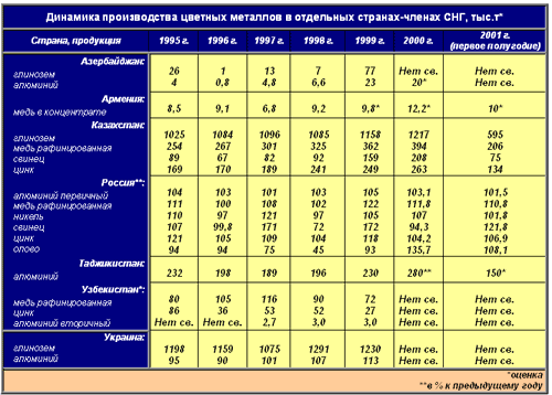 В Армении, Беларуси, Грузии, Казахстане, Кыргызстане и Узбекистане обьем выпуска товарной продукции отрасли превысил показатели 1991 г., а у таких значимых производителей цветных металлов, как Россия и Таджикистан, это превышение составило около 70%, а на Украине - 96%.