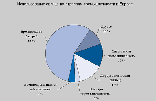 В общемировом производстве и потреблении более 27% приходится на Европу. В Европе свинец используется в основном для производства автомобильных батарей и аккумуляторов, на долю использования которых приходится порядка 60% используемого металла. Другими крупными потребляющими этот металл секторами экономики, безусловно, являются химическая промышленность, где свинец используется как компонент при производстве реагентов и красок, а также сектор IT, где металл применяют в качестве припоев и присадок. Кроме этого благодаря своим уникальным физико-химическим свойствам свинец нашел место при производстве различных инженерных продуктов, как-то защитные покрытия зданий и сооружений (высокая коррозионная стойкость металла, долговечность и простота применения – основные преимущества при его использовании), а также для использования в медицинских нуждах, при производстве рентгенографической и спектрографической аппаратуры. Более подробно структура потребления цинка по секторам промышленности приведена на графике 1.