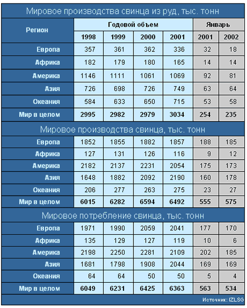 Из более чем 6.4 млн. тонн, производимого в мире свинца приблизительно треть приходится на Европейские страны. А из всего объема произведенного металла из руд выплавляется только порядка 40%. Это обусловлено тем, что при производстве свинца активно используют вторичные ресурсы, доля которых на ряде рынков достигает 60-70%. Данные по производству металла из руд приведены в таблице 1. Непосредственно в Европе рудная база развита слабо, поэтому основным производителем свинца в мире являются неевропейские страны.