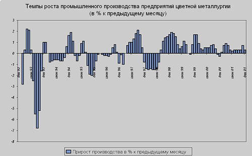 Как видно из графика 1 после девальвации 1998 года отрасль резко увеличила темпы роста объемов производства. На период с августа 1998 по июль 2000 средняя скорость прироста объемов производства достигла 1.2-1.4% в месяц, что являлось наилучшим показателем за последние 10 лет. Кроме того, такой прирост объемов производства наложился на благоприятную внешнюю конъюнктуру, когда цены на все базовые металлы росли (благодаря увеличившемуся спросу и некоторому дефициту наличного металла) на несколько процентов в месяц, что позволило отечественным производителям цветных металлов получать огромные валютные поступления от экспорта. После снижения эффекта девальвации, падения спроса со стороны основных потребителей и снижения цен на металлы в отрасли сильнее проявились те негативные факторы, которые были несущественны при благоприятной внешней конъюнктуре.