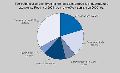 Доля промышленности в общем объеме поступивших иностранных инвестиций в нефинансовый сектор экономики России сократилась до 38.6% (в январе-сентябре 2000 года – 42.1%). Объем иностранных инвестиций в промышленность России в январе-сентябре 2001 года составил 3.755 млрд. долл. Из них прямые инвестиции составили только 31.8%, большая же часть поступила в форме различного рода кредитов. С другой стороны доля банковских кредитов в перевооружение производства постоянно уменьшалась. Несмотря на рост финансовых ресурсов, аккумулируемых банковской системой, происходит общее снижение доли банковских кредитов в целом в ВВП, которая в первом полугодии 2001 года находилась на уровне в 22% – банки не решаются идти на высокие риски и длительный срок окупаемости проектов при кредитовании капитального строительства.