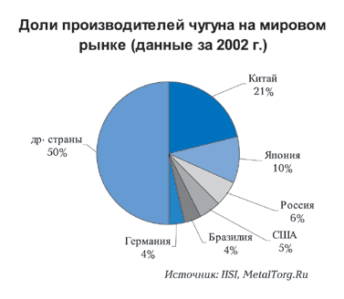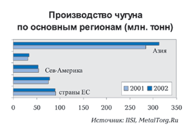 Однако тенденции роста в различных регионах мира существенно отличаются. Производство чугуна выросло в таких регионах, как Азия, СНГ, Южная Америка, Океания. И наоборот, сократилось в ЕС и Северной Америке. Как видим, индустриально развитые страны стремятся сократить у себя доменное производство и предпочитают экспортировать чугун. Основными регионами-экспортерами чугуна в мире являются: Южная Америка, СНГ, Азия. Лидеры среди стран – Бразилия, Россия и Китай (соответственно 3,8 млн. тонн, 3,6 млн. тонн, 3,3 млн. тонн). Любопытно, что в феврале 2003 года Китай из экспортера превращается в активного импортера чугуна на мировом рынке.