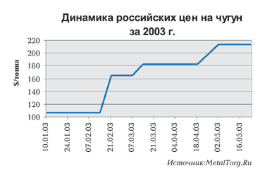 Такая ситуация возникла в феврале 2003 года, когда с ростом производства стали на рынке сформировался дефицит чугуна, что сразу же отразилось на экспортных ценах. Этот рост цен был полностью обусловлен ситуацией на мировых рынках. В США высокий спрос на чугун характеризовался как дефицитом лома, так и дефицитом горячебрикетированного железа из-за забастовок в Венесуэле. Бразилия, один из основных экспортеров передельного чугуна, резко сократила производство из-за начавшегося сезона дождей. Увеличились также и объемы потребления на восточно-азиатском рынке, опять-таки по причине увеличения потребления чугуна в Китае. Кроме того, на рынке появился новый импортер – Индия. В результате полностью загруженными заказами оказались бразильские и российские поставщики. Плавно растущие цены бразильского и российского экспорта в феврале взлетели еще на 20$/тонну. Аналитики прогнозировали тогда продолжение роста цен на чугун до уровня середины 1997 г. до мая месяца, однако уже в апреле наметился спад цен. На приведенном ниже рисунке можно наглядно увидеть динамику цен на чугун за 2003 год (рис.4).