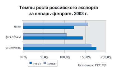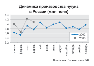 Производство чугуна в самой России в 2003 году значительно опережает темпы предыдущего года (рис.6), что связано как с ростом внутреннего потребления чугуна, так и с увеличением его экспорта.