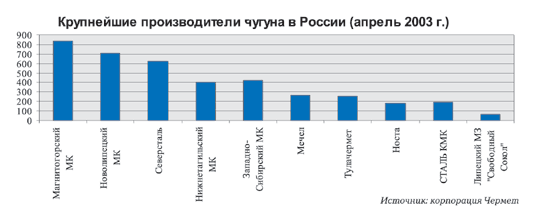 Впрочем, со стороны же основных российских экспортеров чугуна (см. рис.9), ситуацию можно рассматривать по-другому. Благодаря новым российско-американским договоренностям в декабре 2002 года квота на поставки товарного чугуна в США из России увеличена на 1 млн. тонн в год (ранее 600 тыс.тонн). Только за счет дополнительной американской квоты на чугун российские компании получат прибавку в $150 млн.