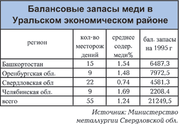 Из 28 разведанных, но неосвоенных месторождений 13 содержат в своих недрах до 100 тыс. тонн меди, а 11 из них – до 50 тыс. тонн. Причем разведка этих «малышей» завершена еще в прошлом веке. Расположены они зачастую не так далеко от перерабатывающих предприятий. Содержание меди в пяти уральских месторождениях (Северо-Ольховское, Чусовское, Восточно-Кушайское,Спасо-Серноколчедановое и Северо-Калугинское) составляет 3,0-5,2%, что значительно превосходит руды большинства осваиваемых объектов. Однако их освоение, ввиду малых объемных запасов, малорентабельно, а стратегические задачи по сырью не решает.