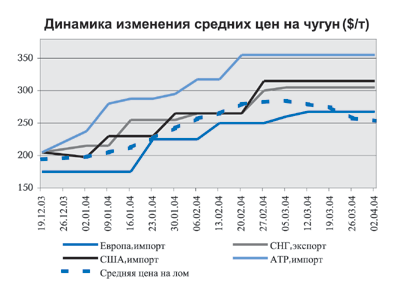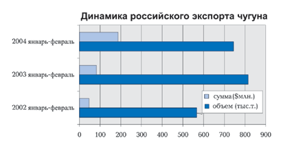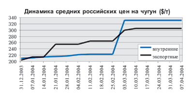 В итоге российские цены на чугун, как и мировые, демонстрируют в начале 2004 года небывалый рост. Относится это как к внутренним, так и к экспортным ценам. Причем экспортные цены России с марта 2004 года начали существенно отставать от внутренних цен, что подчеркивает заметный дефицит чугуна и на внутреннем рынке страны.