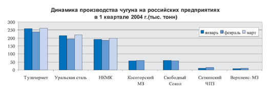 Российские производители чугуна в первом квартале 2004 года демонстрировали стабильный рост производства. Причем первые его причины – растущее производство стали в России и увеличение экспортных квот 2004 года на поставки в США.