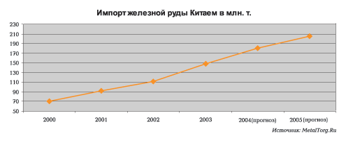 благотворное влияние на регион оказывает Китай. Он сейчас не только самый крупный мировой производитель, потребитель и импортер стали, но и главный потребитель ЖРС. Более 36% мирового спроса на железную руду приходится ныне на долю Китая. Причем, несмотря на сдерживающие меры китайского правительства по «перегреву металлургии», доля Китая на мировом рынке неуклонно растет. А его потребности в железной руде нарастают, ввиду бедной собственной рудной базы. Если в 2003 году Китай импортировал 130 млн. тонн железной руды, в текущем году прогнозируется уже 180 млн. тонн, а в 2005 году – рост до 205 млн. тонн.