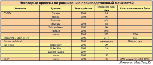 Не успели аналитики обсудить тенденцию заключения долгосрочных контрактов на поставки железной руды ведущими мировыми производителями сырья, как те приготовили новый сюрприз. Речь идет о масштабных планах по расширению железорудных мощностей на 2005 год и в перспективе до 2008 года.