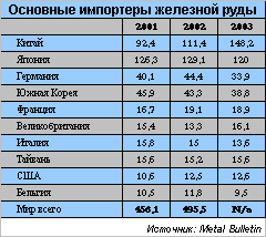 Динамика роста китайского потребления руды в 2004 году потрясает. По статистике за первое полугодие 2004 года импорт руды в Китай вырос до 97,8 млн. тонн, что на 35% больше, чем год назад. В годовом исчислении объем китайского импорта руды в этом году может достичь 200 млн. тонн. По прогнозам крупнейшего мирового производителя железной руды – компании CVRD, спрос на руду со стороны Китая в 2005 году достигнет 33,9% объема ее мирового потребления, т.е. около 200 млн. тонн. Похоже, что к этому рубежу Китай вполне может пройти еще в 2004 году.