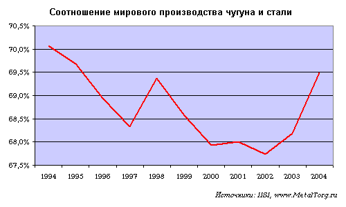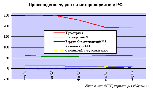 Однако темпы развития этого передела в России в 2005 году резко упали. По данным IISI в России производство чугуна за четыре месяца 2005 года увеличилось на 69 тыс. тонн, а по данным ФСГС – сократилось на 80 тыс.т. по сравнению с уровнем прошлого года. Фактически спор идет о росте (на 0,4% или спаде на 0,5%).