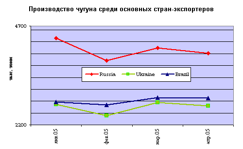 Однако это не так. Все страны-экспортеры чугуна имеют проблемы в полномасштабном развитии национальной металлургии. Увлечение поставками продукции низкого передела (или сырья) на внешние рынки («голландская болезнь») хронически снижает интерес к собственному рынку. К примеру, в Бразилии и Украине, рост производства стали за 4 мес. 2005 года составил только 0,5% и 0,4%. Фактически – это полный откат металлургии на уровень годовой давности.