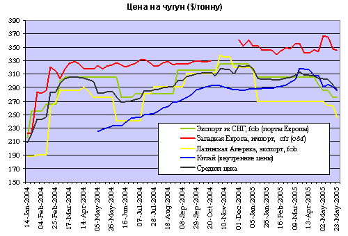 Исходя из данных ГТК, поставки российского чугуна западным странам в январе-марте 2005 года велись в среднем по ценам около $310 за тонну! Однако далее удержать этот уровень цен явно не удастся. В апреле-мае мировые цены на чугун пошли на спад.