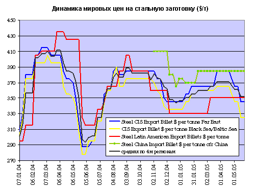 Во первых – отметим что ряд сводок от Metal Bulletin не вполне соответствует реальным ценам. Пика цен в ЕС ноябре 2004 года или стабилизации цен Латинской Америки в начале 2005 года нет. Цены большинства регионов мира с начала 2005 года снижались, при одновременном росте азиатских цен. В общей сложности в январе-марте 2005 года Китай закупил на мировом рынке более 300.000 т передельного чугуна, что обеспечило плавный рост цен до уровня $320-330 за тонну на условиях c&f. Еще в начале апреля некоторые трейдеры отмечали продажи чугуна в Китай по цене $335 за тонну c&f. Сейчас, после майских праздников китайские покупатели преимущественно «молчат», поэтому сейчас цены на чугун в Азии пошли вниз.