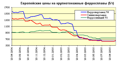 Цены на эти виды крупнотоннажных ферросплавов в текущем году побили все рекорды снижения, опускаясь в среднем на $200/т за квартал. На начало мая 2005 года цена на ферромарганец упала до уровня $690-700/т по сравнению с январем, когда цены были равны $1300-900/т. После весеннего «обвала» лето не принесло долгожданного подъема, а наоборот продолжило плавный спад, словно цены продолжали «таять от летней жары». Высокоуглеродистый ферромарганец погрузился еще на $10 до глубины $510 - $515/ т. В США цены на ферромарганец упали до $520-550/т, а в ЕС он подешевел до $600/т. Спрос, скользил вниз, слизнул еще 1% от цен свободного рынка на ферросилиций, которые на начало августа составляли 43-44 цента за фунт. Силикомарганец в ЕС подешевел от 700-720 евро/т в январе до менее 600 евро/т в апреле и 480-495 евро/т в июле.