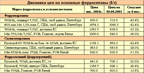 Сокращение производства мировыми металлургическими компаниями во 2-м и 3-м кварталах 2005 года привели к резкому снижению активной торговли на рынке ферросплавов, особенно большие потери отмечались на спотовом рынке. Металлурги, сокращая производство, совсем не спешили покупать, надеясь на дальнейшее снижение цен. Напомним, что в себестоимости стали типовой вклад ферромарганца-силикомарганца близок к 5%.