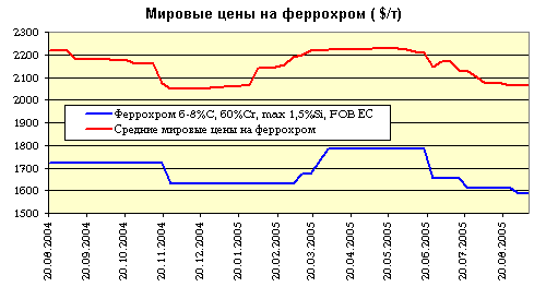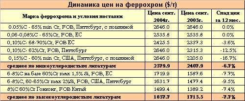 На обстановке начала года сказалось введение Китаем экспортной пошлины на феррохром в размере 5%, которое снизило объемы китайского экспорта. Стартовал некоторый рост мировых цен, ускорившийся в феврале-марте 2005 года. К июню низкоуглеродистый феррохром продавался по рекордной средней цене $2550 за тонну, а высокоуглеродистый феррохром - по цене $1690-1700 за тонну. Вслед за мировыми ценами в апреле-мае цены в Европе поднялись до уровня 1770-1790$/т. Однако к июлю они снизились до отметки 1650$/т, а к августу снизились еще на $50. Цены американского рынка пережили аналогичный взлет и спад. Если в мае цены 65% феррохром $0,75/фунт, то уже к середине августа они опустились к отметке $0,67/фунт. На последнюю неделю августа цены на феррохром составляли порядка 60-61 цента за фунт и были признаны «неадекватными рынку». Хотя производители и настаивали на том, что разумные цены – это около 65 центов, но торговые сделки в США на конец лета совершались по основной цене 60-61 цента за фунт, и только небольшое количество - по цене 63-64 цента за фунт.