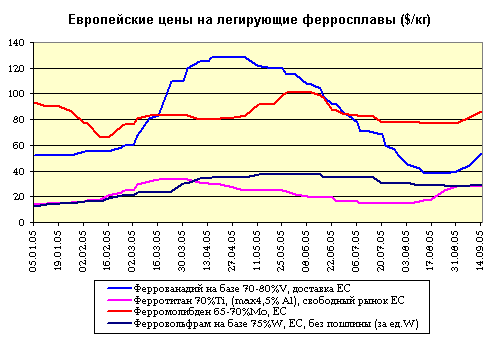 Феррованадий в начале текущего года стал дефицитным товаром по двум причинам: ожидания роста спроса на полуфабрикаты и конструкционную сталь и сокращение его производства в Европе, Китае и Южной Африке. Помог бурному росту цен феррованадия до апреля 2005 года и рост цен на руду (пентоксид ванадия и т.д.). Взлет цен был мощным, но недолгим, поскольку прогнозы роста стального рынка не оправдались. К примеру, экспорту китайской стальной заготовки (рекордному в марте 2005 года) был поставлен административный заслон. С мая (уровня 120-130$/т) цены на феррованадий начали неуклонное снижение. Так феррованадий на рынке ЕС снизился в цене до предложений в $35-39 за кг (ванадия), а минимум цен был пройден в конце августа. После обвала цен в середине лета аналитики ожидали еще большего снижения цен и на дорогом рынке США. Однако информации трейдеров о заключенных сделках не было, а сводка MetalBulletin (соответствовавшая цене 68,4 $/кг) по рынку США замерла на цифрах от 22 июля. В новостях из США сообщалось, что «благодаря чуть более высокой активности цены в США удержались на чуть более высоком уровне 23-25 долл. за фунт», чем в ЕС.