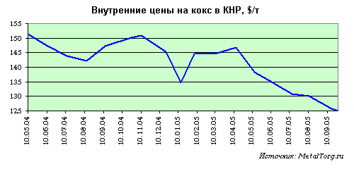 По оценкам специалистов в общей сложности в КНР около 25 млн. тонн продукции коксохимических заводов были принесены в 2005 году «в жертву» новым жестким подходом к экологическим требованиям и снижению энергозатратности (в рамках «нового стального курса»). Однако эти меры не смогли остановить китайское падение цен, которые скатились вплоть до отметки US$120-130 / т (на сентябрьские поставки кокса).