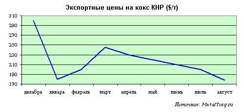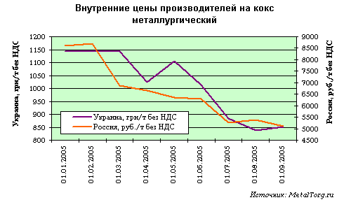Как отмечают все участники рынка, спад цен на кокс обусловлен значительным снижением цен на коксующиеся угли. Эксперты сообщают, что уже в октябре следует ожидать некоторого роста цен на кокс и коксующиеся угли вследствие заключения договоров на 4 квартал 2005 года.