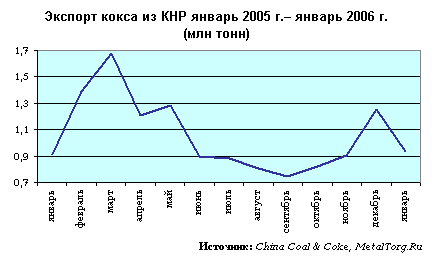 Неуклонно продолжает изменяться ситуация с экспортом китайского кокса. Затраты на экспортные лицензии по коксу снизились до US$5-10 за тонну, однако власти продолжают наращивать ограничения в части выдачи этих лицензий. По данным таможенной службы КНР, за 2005 г. Китай экспортировал только 12,76 млн тонн кокса, что на 15% ниже объемов прошлого года.