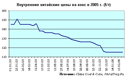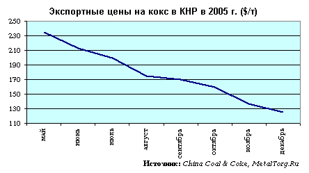 Средняя экспортная цена на китайский кокс за 2005 год составила US$186 за тонну на условиях FOB по сравнению с $250 за тонну в 2004 г.