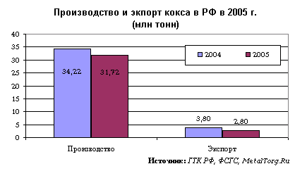 Как известно, первые признаки такого спада появились во втором квартале, когда и начало свое падение производство кокса. Такое же настроение испытывал и экспортный рынок кокса и полукокса. Экспорт этого вида сырья из РФ за 2005 г. снизился на 16%.