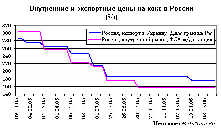 Проблема падающих цен, кстати, стала с декабря 2005 года причиной осложнений с перевозками коксующихся углей и кокса. По данным ОАО "РЖД" зимой 2005-2006 года произошел срыв перевозок российского угля, в том числе коксующегося. Только в Кузбассе из-за массового отказа от поданных ранее заявок недогруз угля составил более 3 млн тонн, ОАО "РЖД" сообщила в январе 2005 года, что считает главной причиной срыва перевозок то, что «угольщики не могут договориться с металлургами о новых ценах на коксующийся уголь».