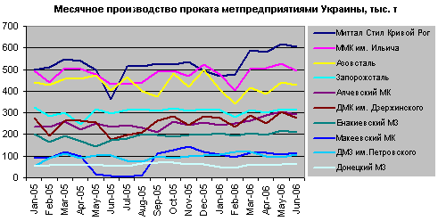 По отдельным предприятиям черной металлургии ситуация, естественно, отличается. Их динамика выпуска готового проката по месяцам 2006г. приведена на рис.2.