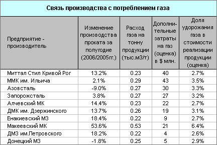 Четкой связи производственно-финансовых показателей отдельных металлургических заводов с уровнем газопотребления нет. К примеру, более заметно влияние реорганизации предприятий (Миттал Стил Кривой Рог, Донецкий МЗ, Макеевский МК). В целом по отрасли дополнительные финансовые затраты метпредприятий Украины от удорожания газа по разным оценкам составили от $265 до 410 млн. Для большинства это составило 2,5-3% в выручке предприятий. Однако эти потери в I полугодии они были полностью компенсированы хорошей конъюнктурой мирового стального рынка (рост цен до 15%).