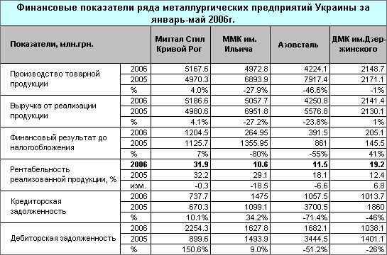 На момент подготовки этой статьи финансовые результаты предприятий за первое полугодие 2006 года были еще неизвестны. Однако, для определения тенденции вполне достаточно проанализировать их за январь-май текущего года. В качестве примера рассмотрим данные по ряду крупнейших заводов, выпускающих около 58% стального проката в Украине (см. табл.2).